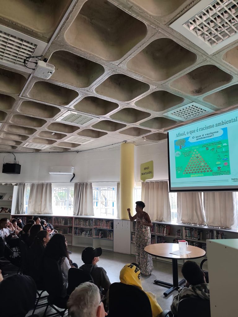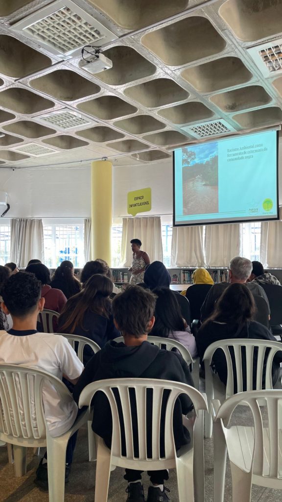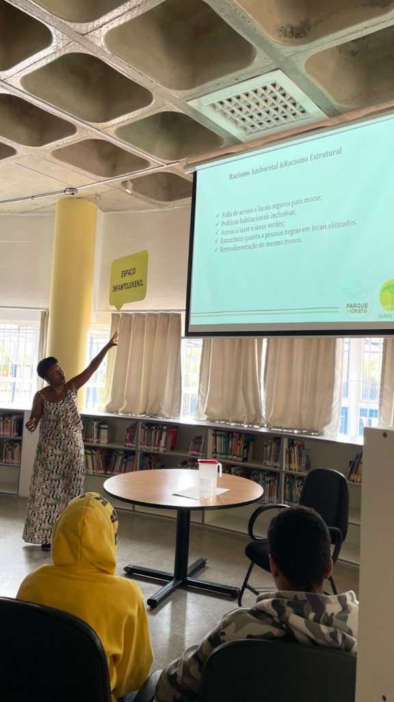 Compartilhou sobre o trabalho de educação ambiental crítica que vem sendo desenvolvido no Parque do Cristo. Em seguida, apresentou a palestra, que tem realizado em Viçosa com as escolas parceiras e comunidades do entorno do Parque, sobre o tema: “Os impactos do Racismo Ambiental e do Racismo Estrutural na vida da população negra”.