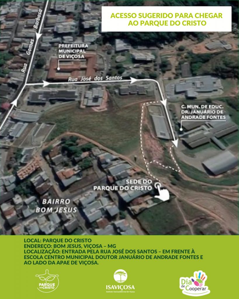 A equipe ISAVIÇOSA, que trabalha na implementação do Parque Natural Municipal do Cristo Redentor, junto às cooperativas de Viçosa que promovem o Dia C – Dia de Cooperar 2025, tem a satisfação de convidar toda a população viçosense para um mutirão de plantio de mudas no Parque do Cristo.