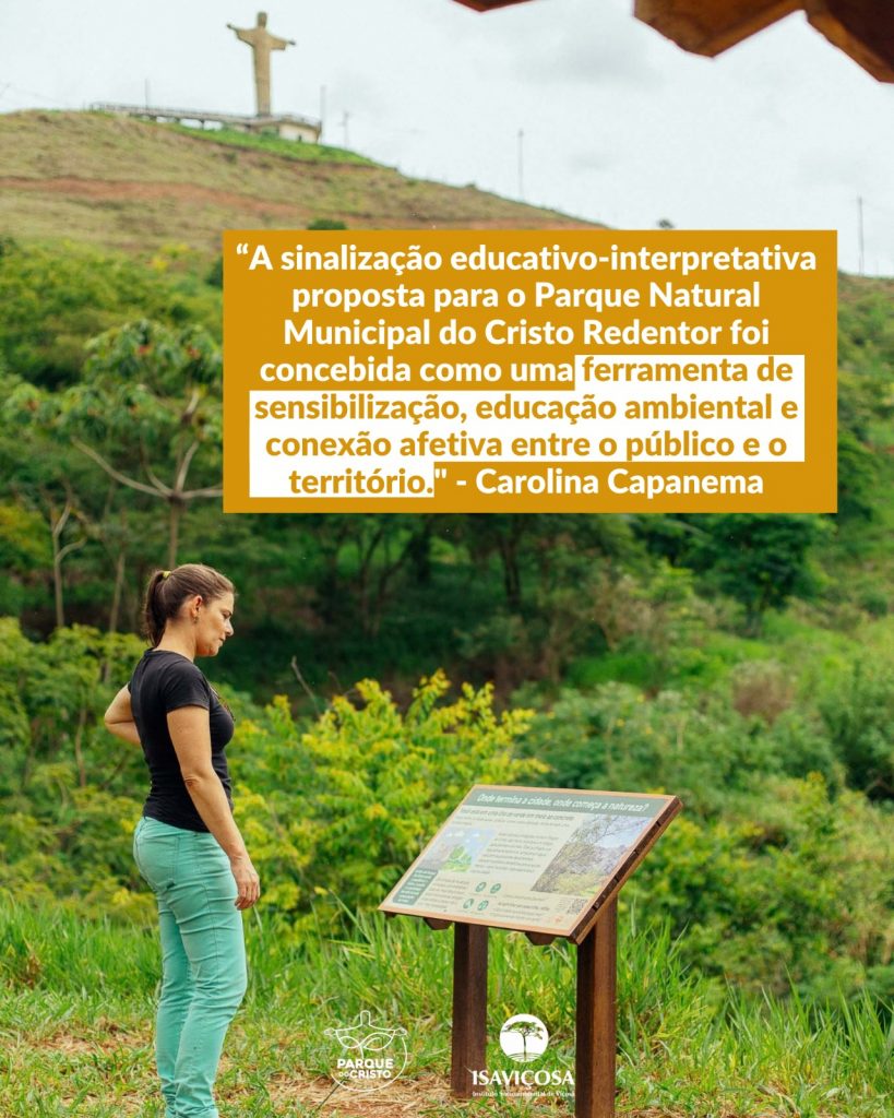 Carolina nos explica o objetivo dessas placas: “A sinalização educativo-interpretativa proposta para o Parque Natural Municipal do Cristo Redentor foi concebida como uma ferramenta de sensibilização, educação ambiental e conexão afetiva entre o público e o território. Muito além de placas informativas, os conteúdos foram elaborados com base em uma narrativa integradora, que convida os visitantes a reconhecerem o parque como espaço vivo, histórico,